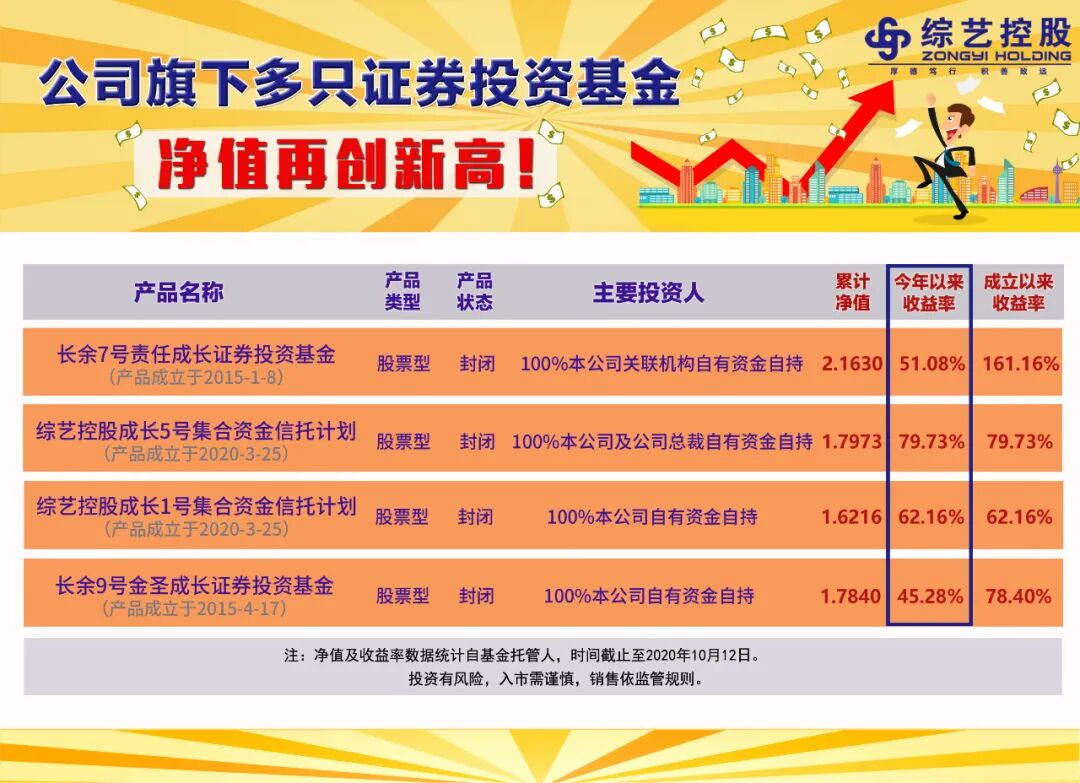 10月15日今天,公司旗下上海小金牛公益基金会和公司总裁再次动用自有资金追加认购公司管理的基金产品:综艺控股成长1号集合资金信托计划。